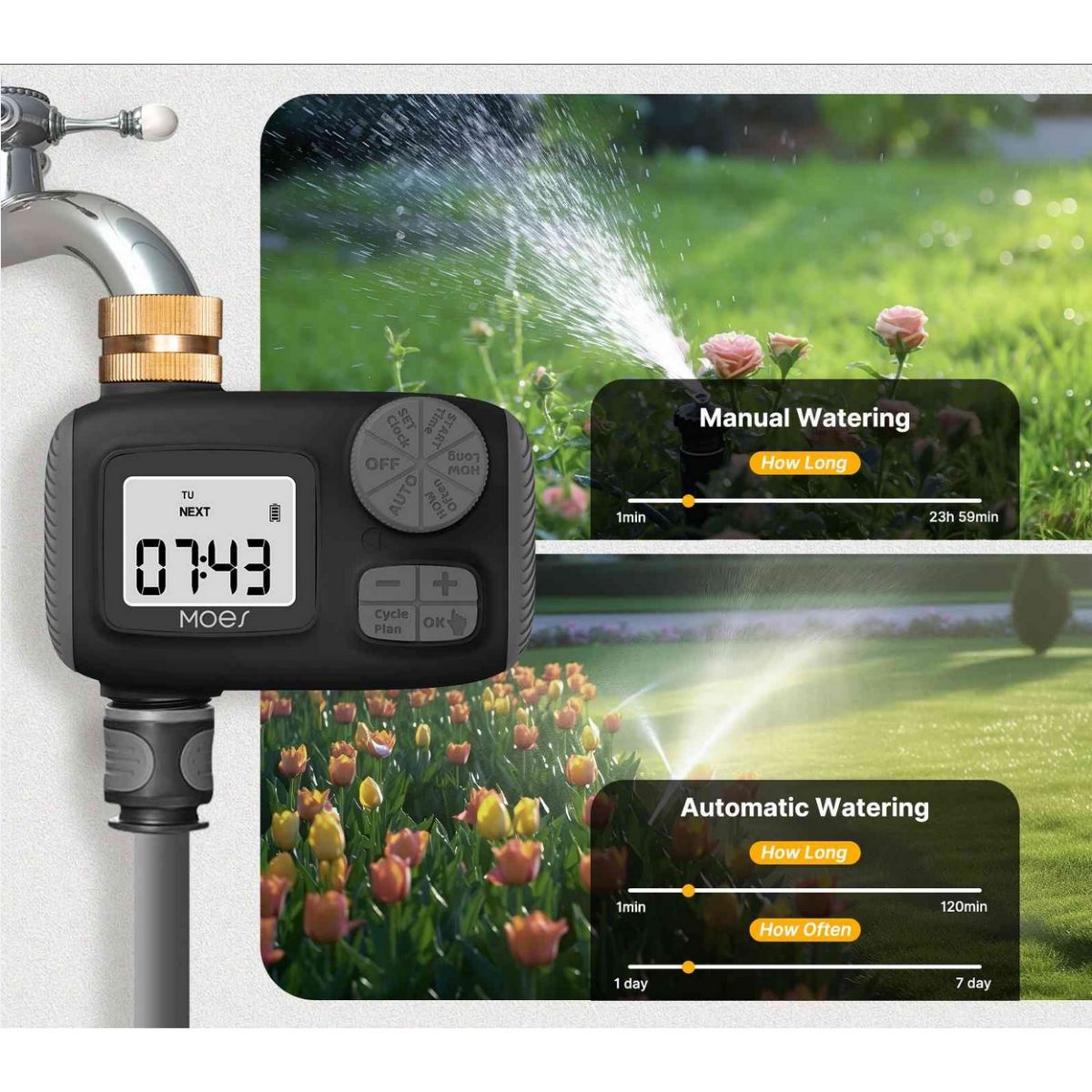 Optimiza tu jardín con el Temporizador de Riego Moes TWV-YZD01. Este dispositivo automático y fácil de usar te permite programar el riego para un cuidado eficiente y sin preocupaciones. Alimentado por pilas AA, es ideal para mangueras y sistemas de goteo. Su diseño robusto con certificación IP54 garantiza durabilidad en exteriores, ofreciendo flexibilidad con modos de operación manual y automático.