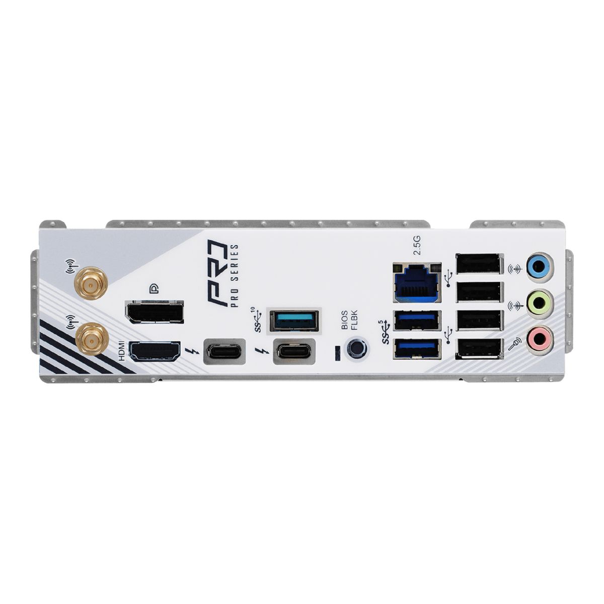| Panel trasero E/S | - 2 x Puertos de antena - 1 x puerto HDMI - 1 x DisplayPort 1.4 - 2 x Thunderbolt™ 4/USB4 Type-C Ports (40 Gb/s)* - 1 x puerto USB 3.2 Gen2 Type-A (10 Gb/s) - 2 x puertos USB 3.2 Gen1 - 4 x puertos USB 2.0 - 1 x Puerto RJ-45 - 1 x Interruptor Flashback del BIOS - Conectores HD Audio: entrada de línea / Altavoz Delantero / Micrófono |
